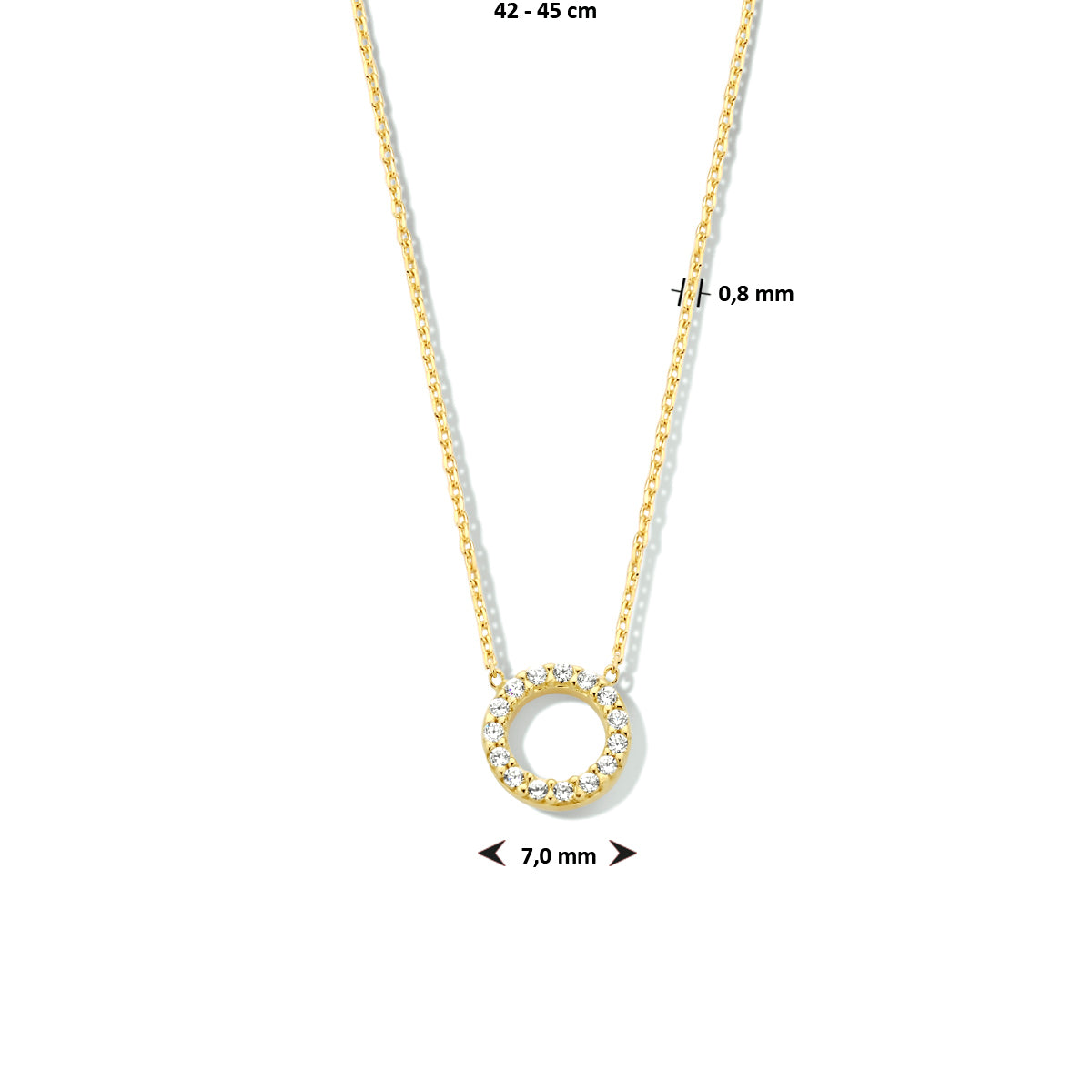 14k yellow gold necklace featuring a round pendant with a sparkling row of cubic zirconia. The necklace has a wearing length of 42 cm and 45 cm. The round pendant is 7mm in diameter. The link width is 0.8mm.