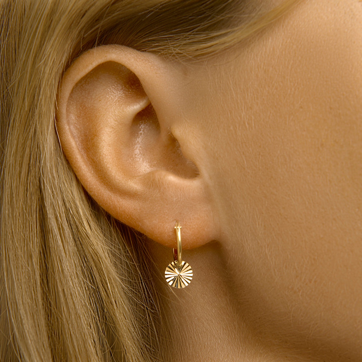 14k geel gouden oorbellen met een ronde hanger. De oorbellen hebben een diameter van 13 mm. De hanger meet 7mm in diameter.